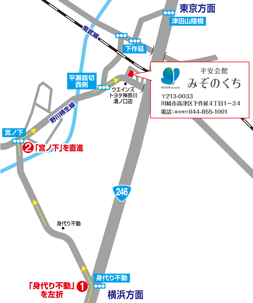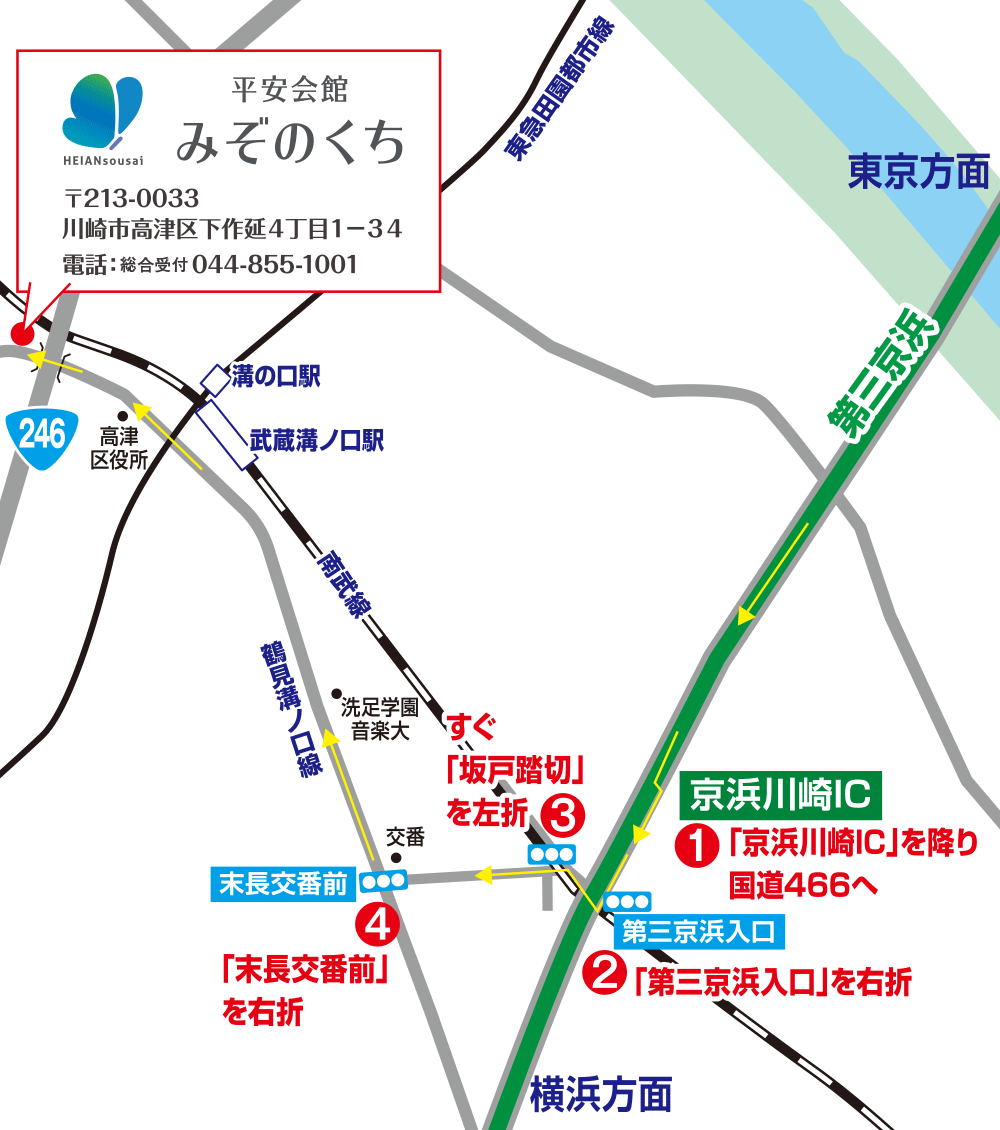 - 電車をご利用の場合は、東急田園都市線・大井町線の「溝の口駅」南口から徒歩7分、JR南武線の「武蔵溝ノ口駅」から徒歩10分にございます。お車をご利用の方は、第三京浜道路「京浜川崎IC」か東名高速「東名川崎IC」をご利用ください。