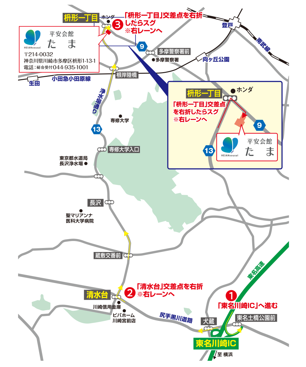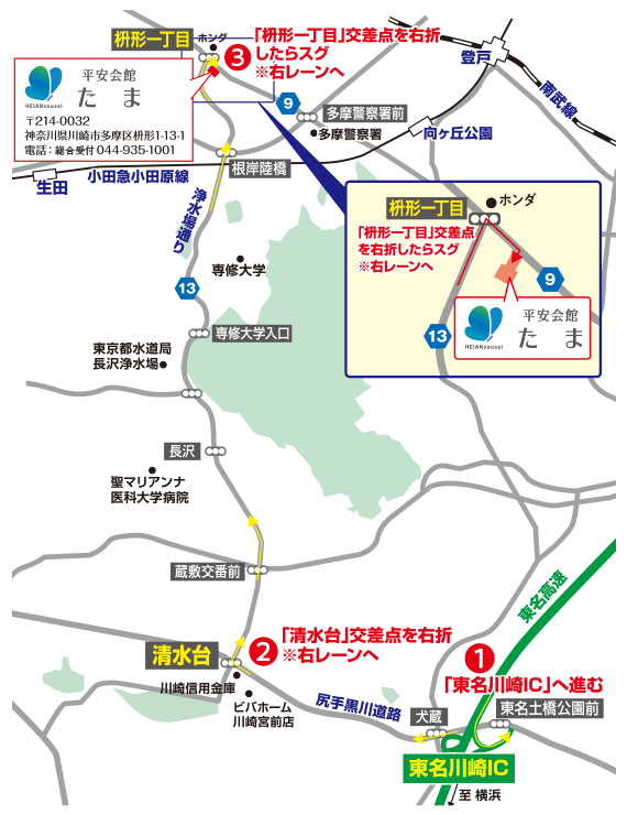 - JR南武線・小田急線「登戸駅」北口バス乗り場より、市営バス/登14系統(西菅団地行)「明王」バス停のご利用、もしくは小田急線「向ヶ丘遊園駅」北口バス乗り場より、小田急バス/向11系統または向13系統「多摩警察署前」バス停をご利用ください。お車をご利用の方は、東名高速「東名川崎IC」か中央高速「稲城I.C」をご利用ください。