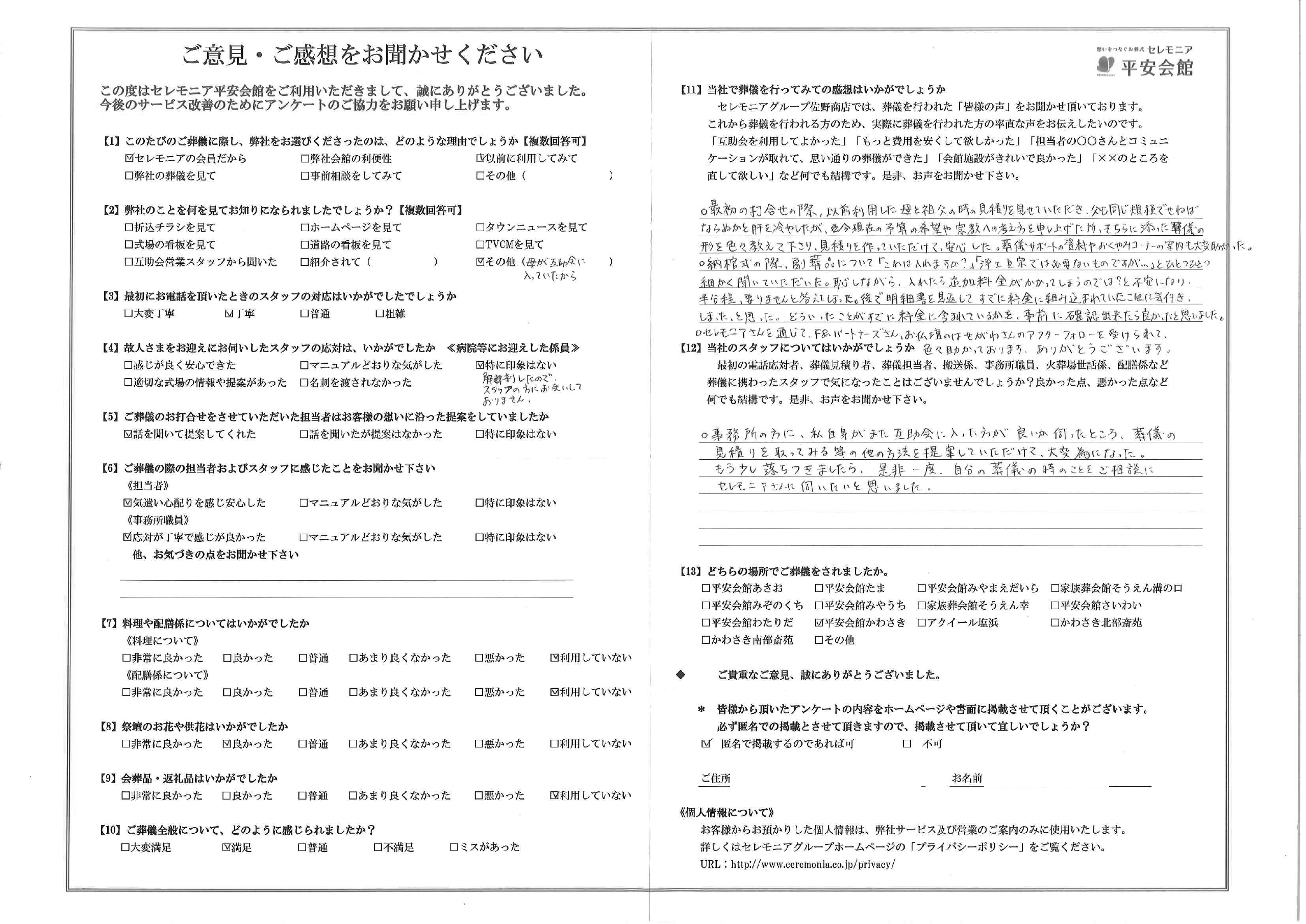 ・セレモニアさんを通じて、F&パートナーズさん、お仏壇のはせがわさんのアフターフォローを受けられて、色々助かっております。ありがとうございます。