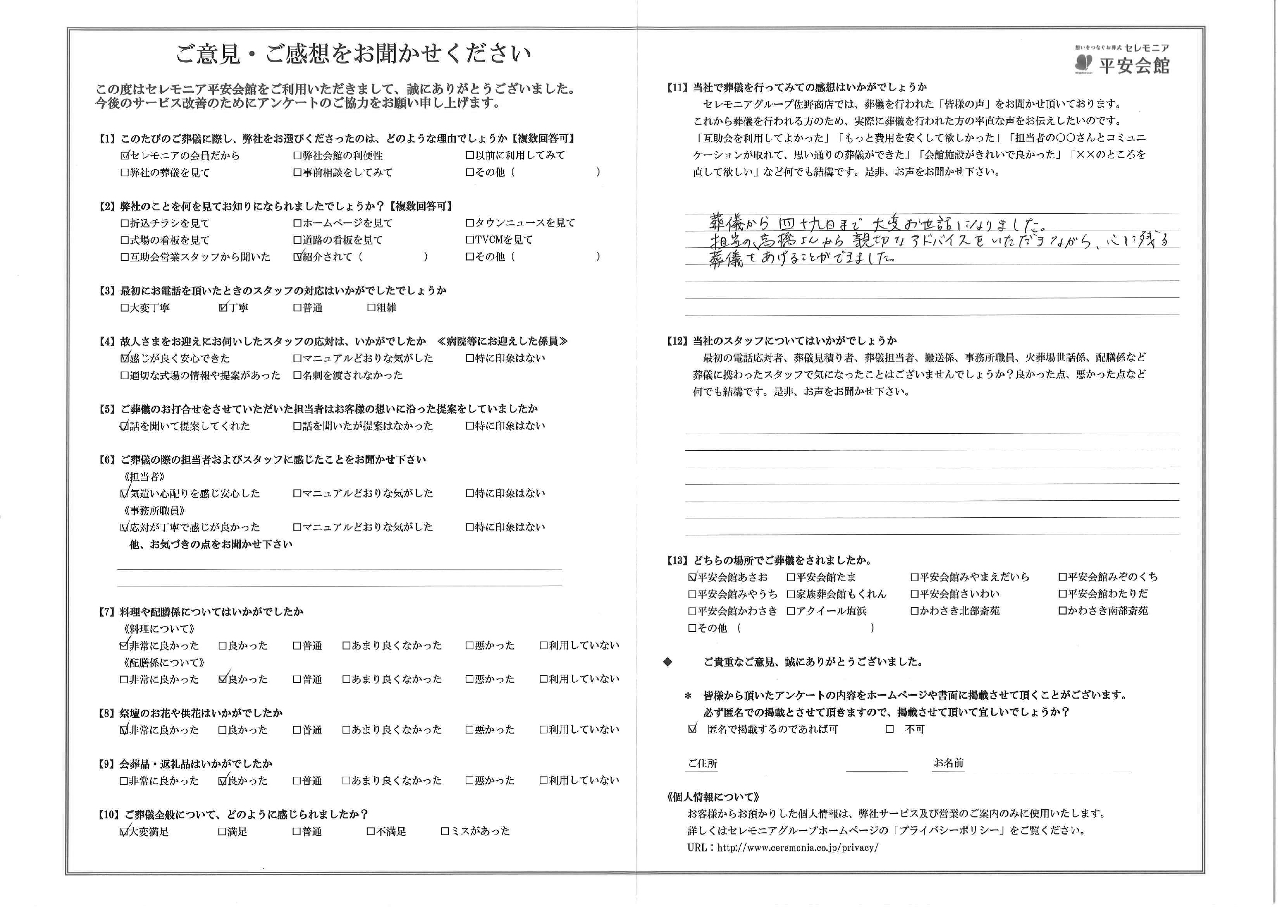 葬儀から四十九日まで大変お世話になりました。