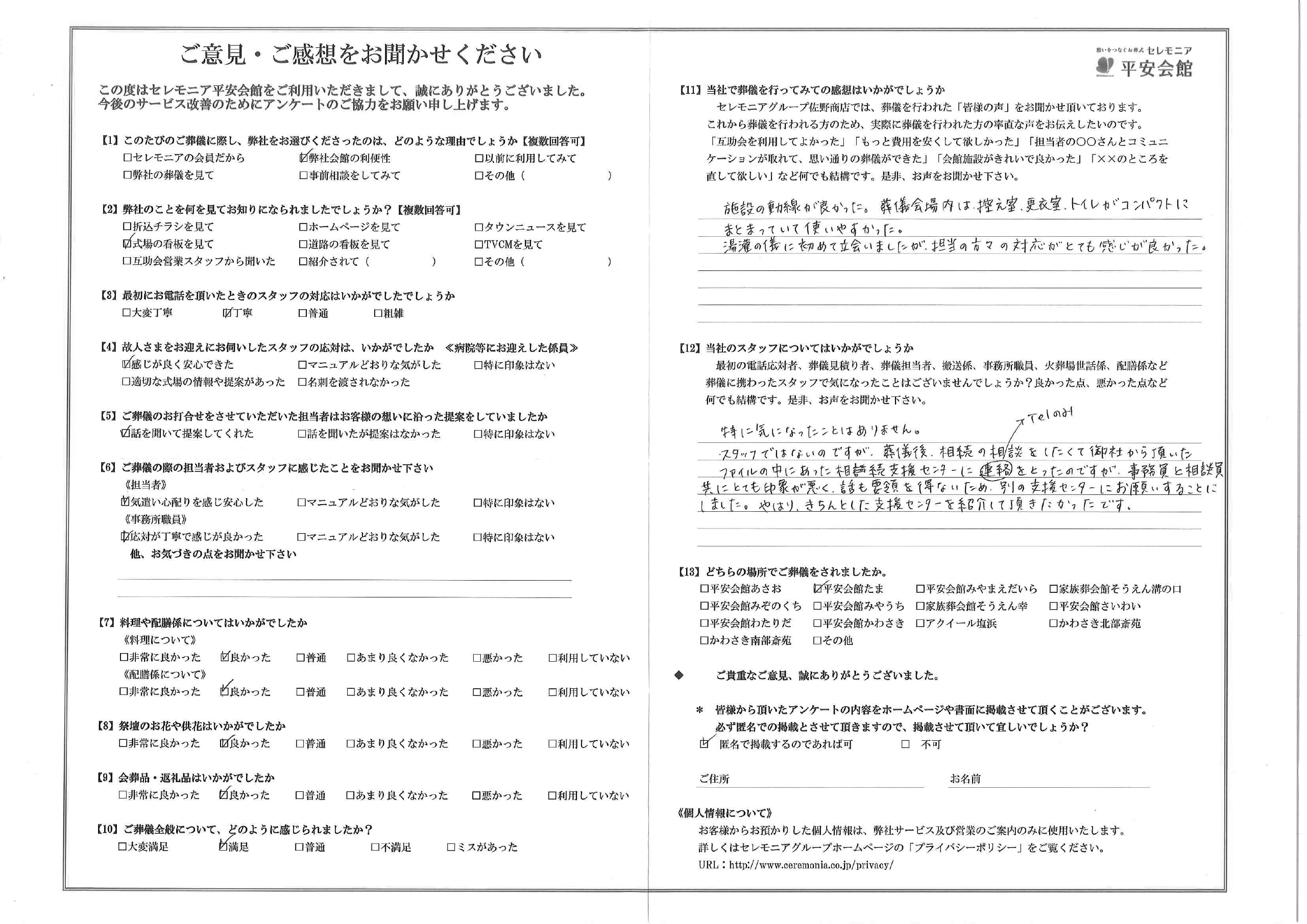 湯灌の儀に初めて立ち会いましが、担当の方々の対応がとても感じが良かった。