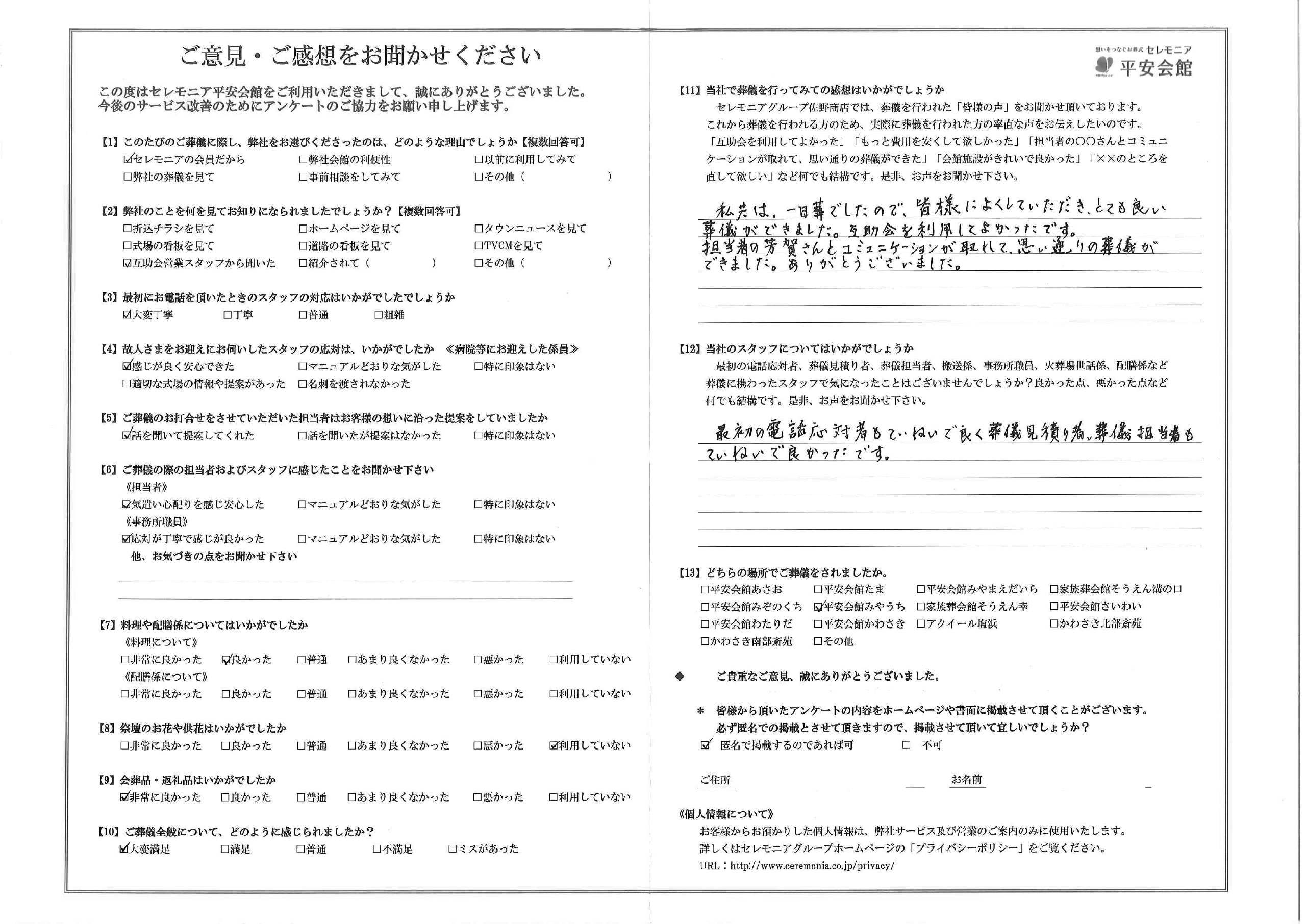 私共は、一日葬でしたので、皆様によくしていただき、とても良い葬儀ができました。互助会を利用してよかったです。