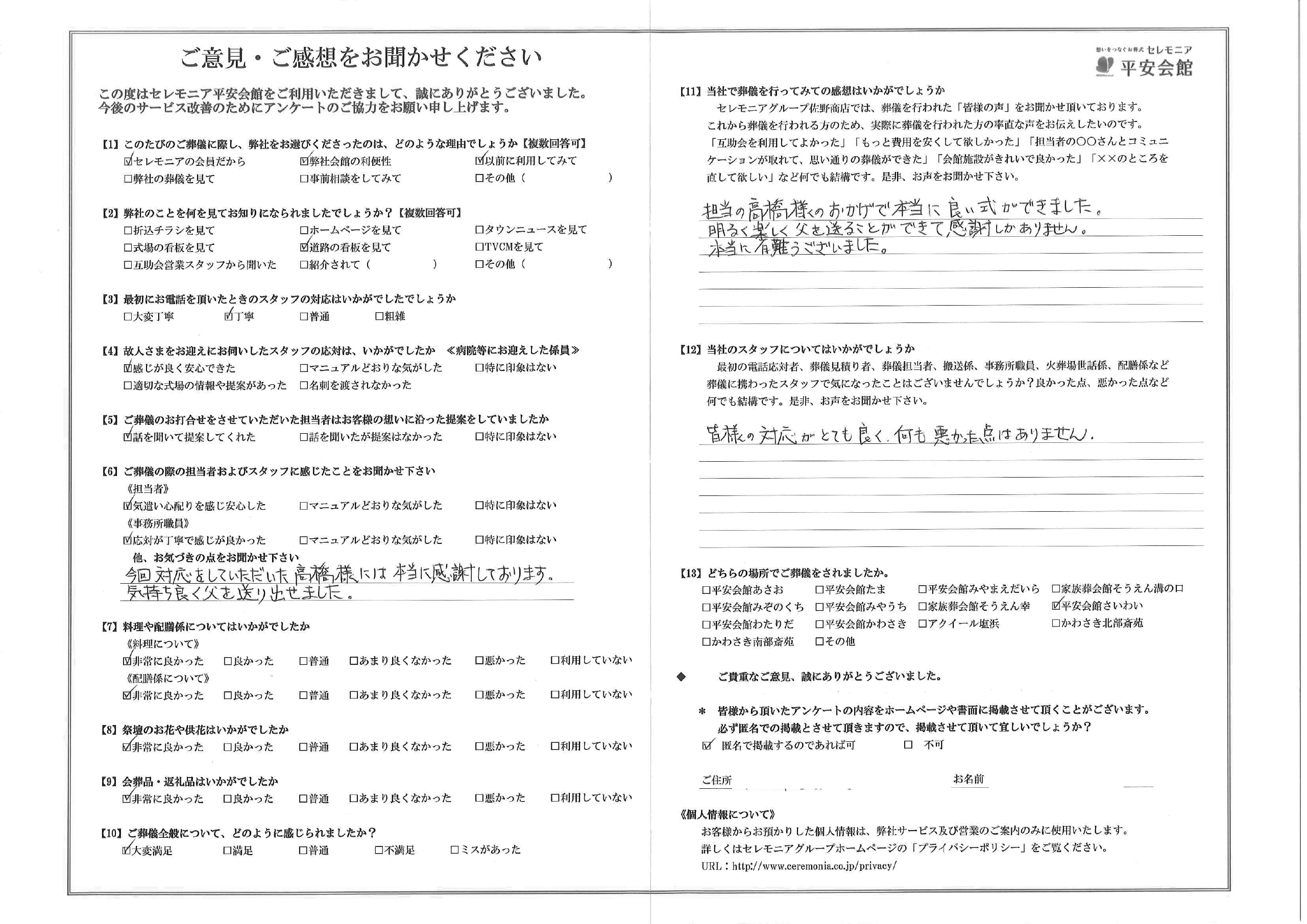 ご葬儀の際の担当者およびスタッフに感じたことをお聞かせ下さい