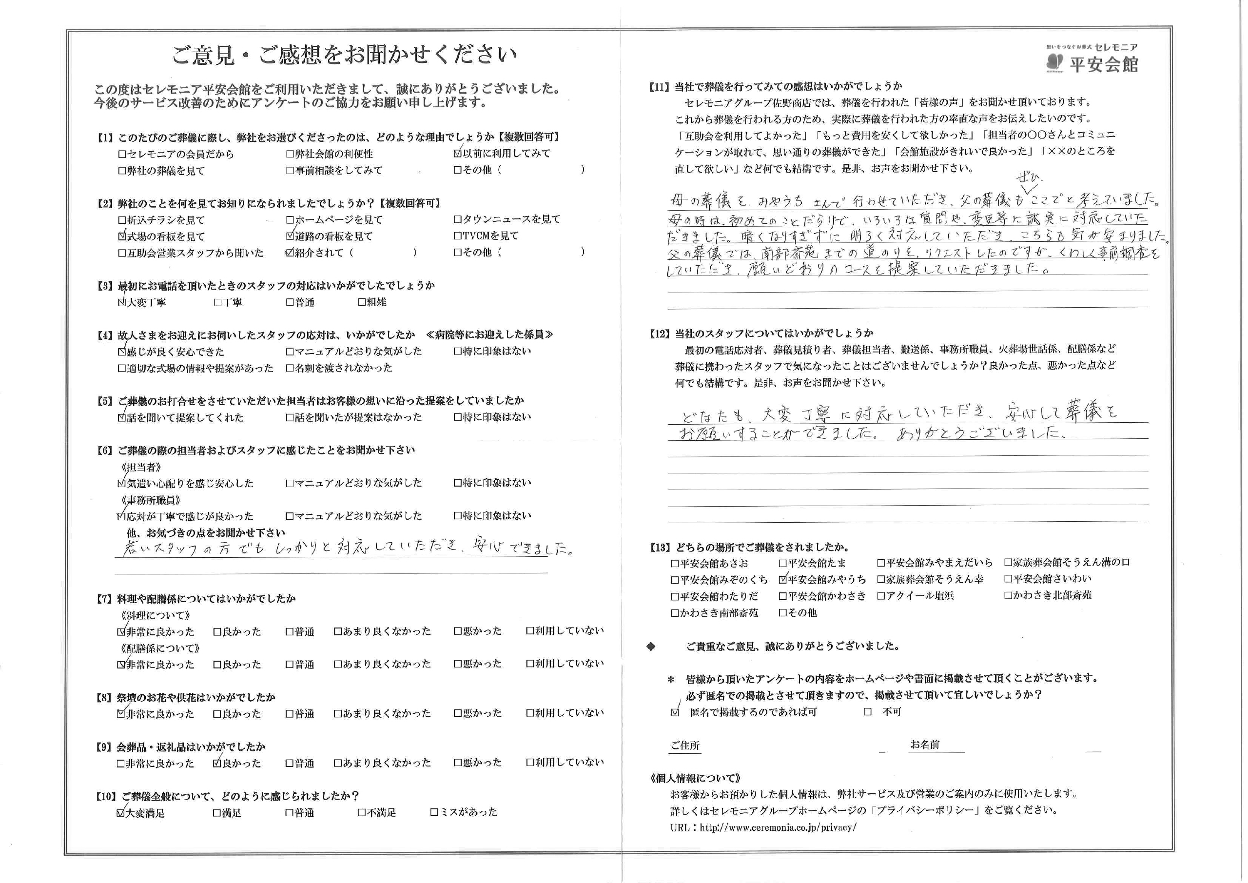 母の葬儀をみやうちさんで行わせていただき、父の葬儀もぜひここでと考えていました。母の時は、初めてのことだらけで、いろいろな質問や変更等に誠実に対応していただきました。暗くなりすぎずに明るく対応していただき、こちらも気が安まりました。