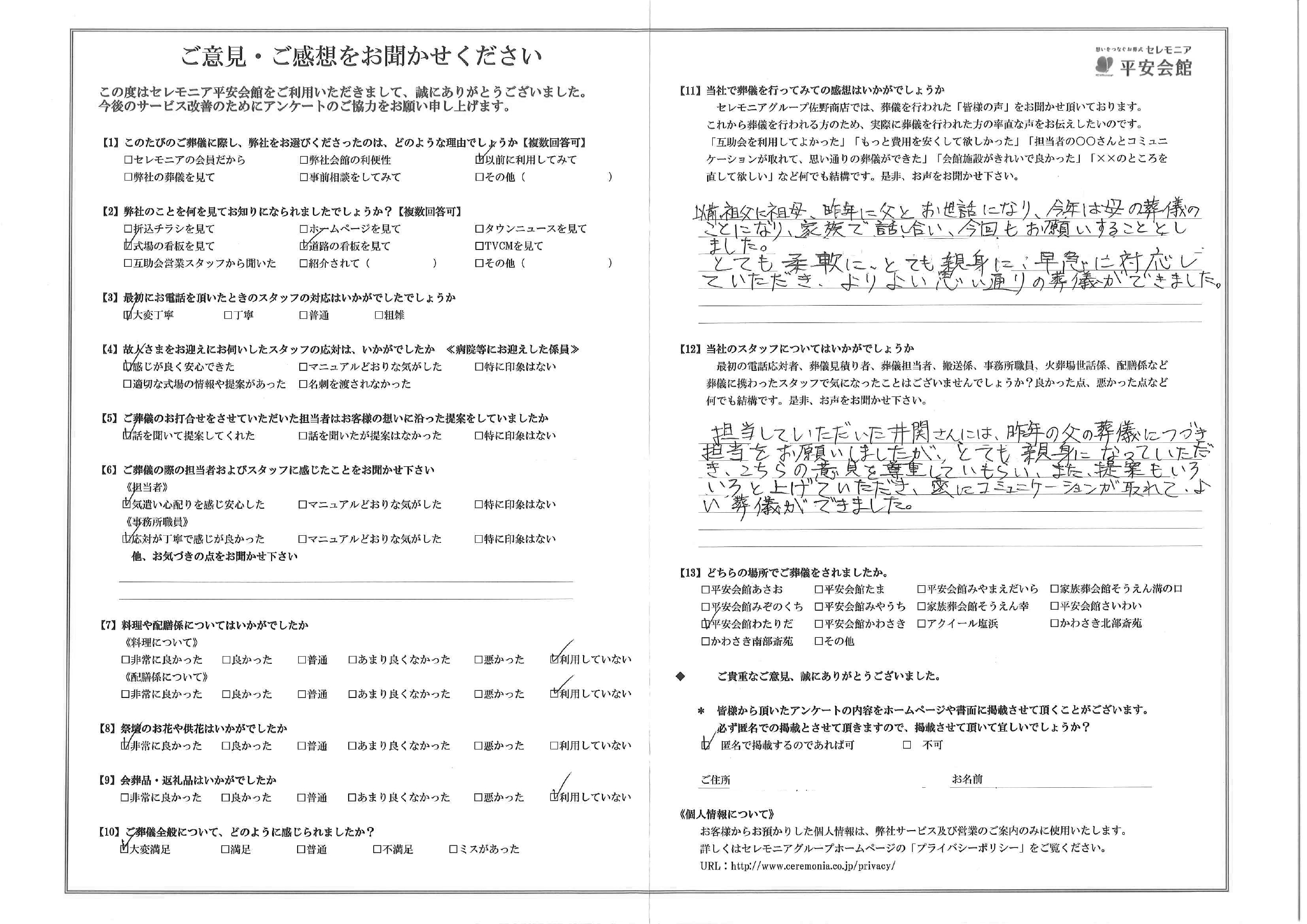 担当していただいた井関さんには、昨年の父の葬儀につづき担当をお願いしましたが、とても親身になっていただき、こちらの意見を尊重してもらい、また、提案もいろいろと上げていただき、密にコミュニケーションが取れてよい葬儀ができました。