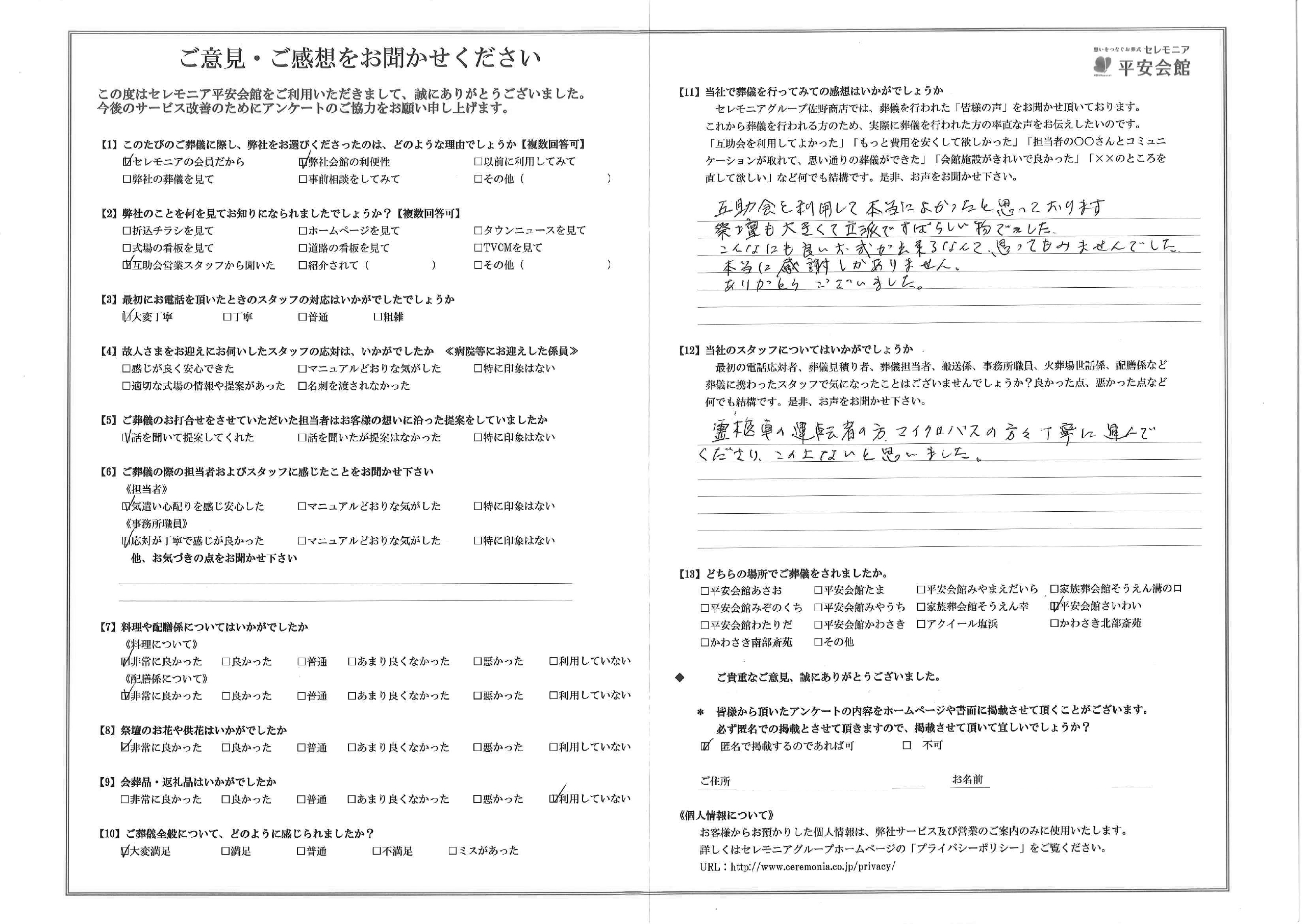 霊柩車の運転者の方、マイクロバスの方々丁寧に運んでくださりこの上ないと思いました。