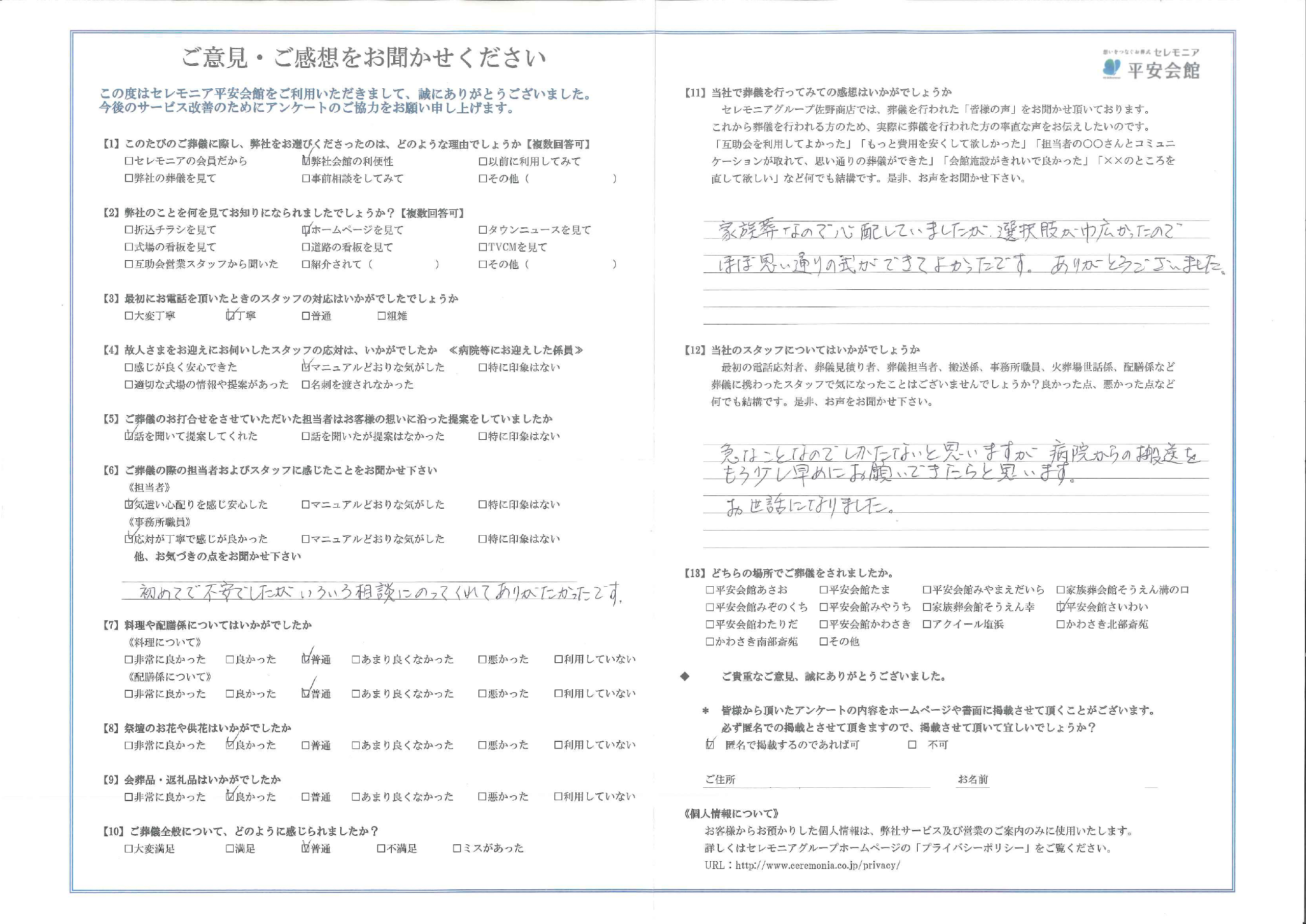 家族葬なので心配していましたが、選択肢が巾広かったのでほぼ思い通りの式ができてよかったです。ありがとうございました。