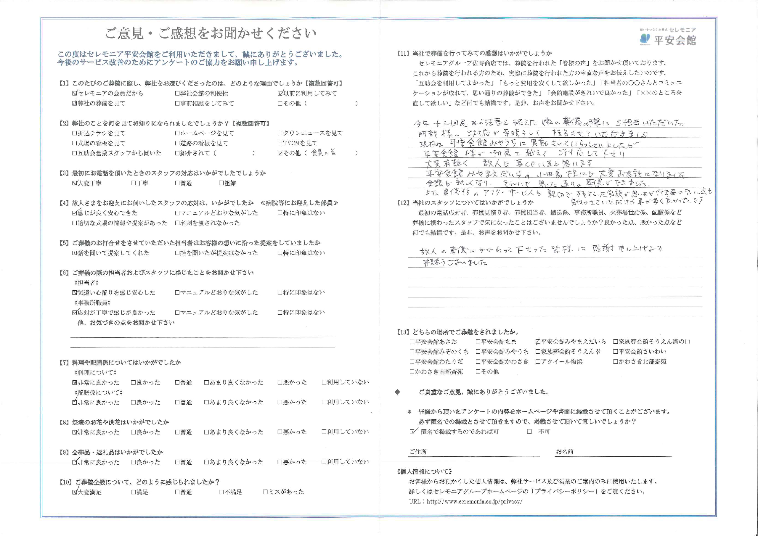 今年十三回忌の法要を終えた嫁の葬儀の際にご担当いただいた阿部様のご対応が素晴らしく指名させていただきました。現在は平安会館みやうちに異動されていらっしゃいましたが平安会館様が所属を越えてご対応して下さり大変有難く故人も喜んでいると思います。
