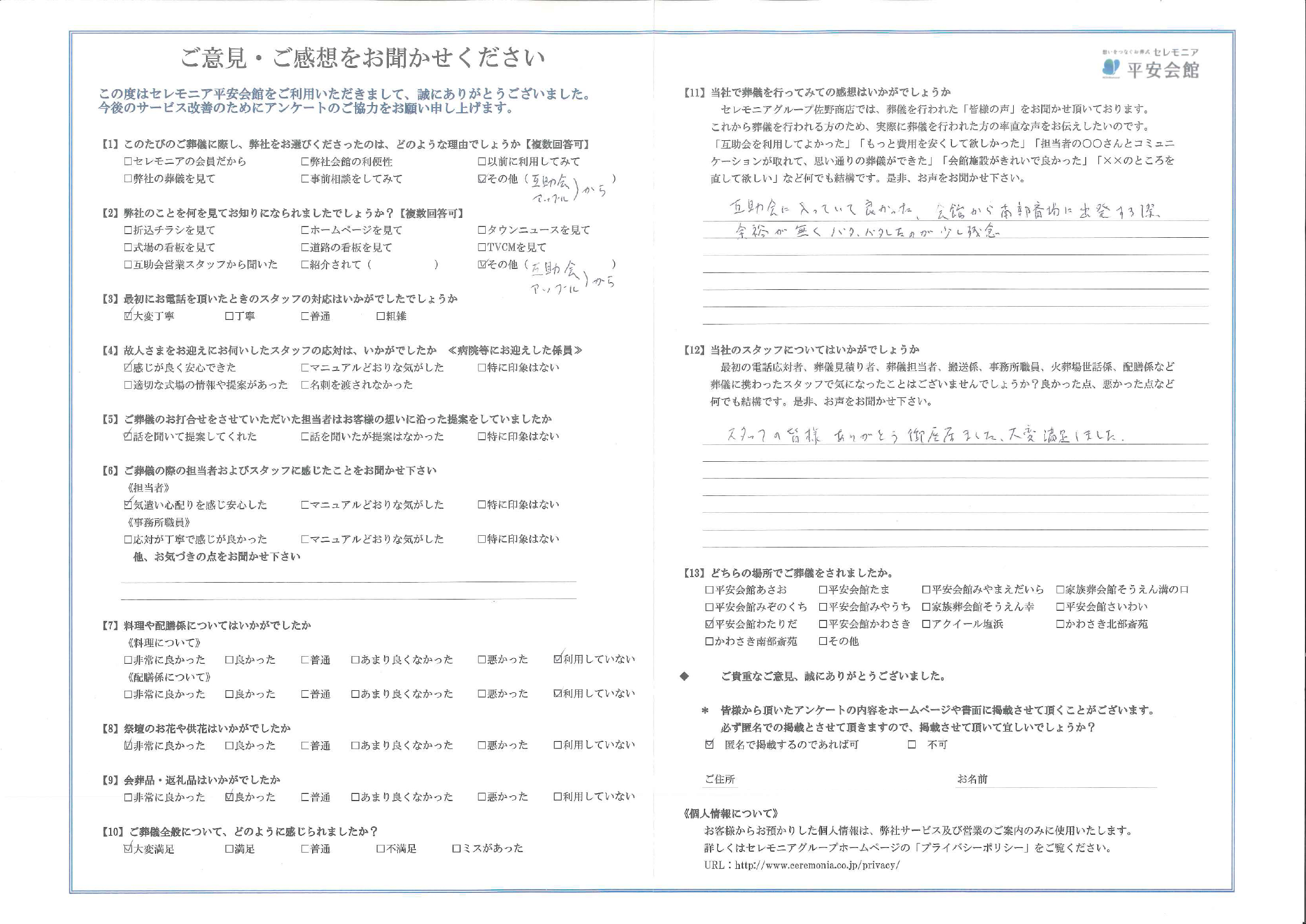 ご葬儀の際の担当者およびスタッフに感じたことをお聞かせ下さい