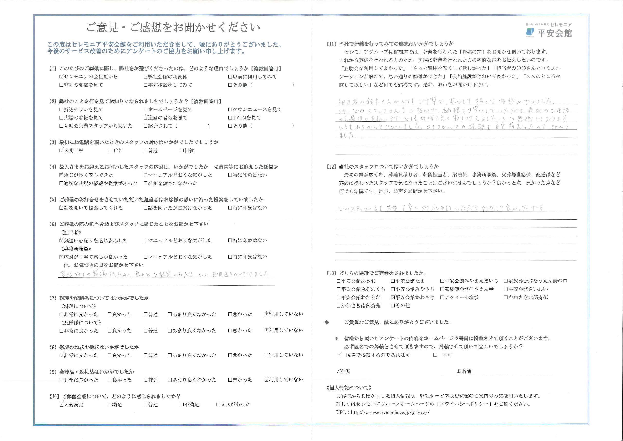 他、どのスタッフさんもご親切で、納棺も丁寧にしていただき 最初のご連絡から最後の支払いまで、とても気持ち良く取り行えましたことに感謝しております。