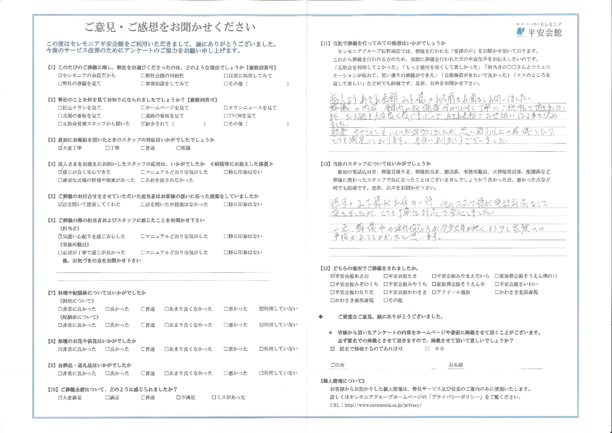 また、お人柄も大変良く感じましたので、あさお会館でお世話になる事を決めました。