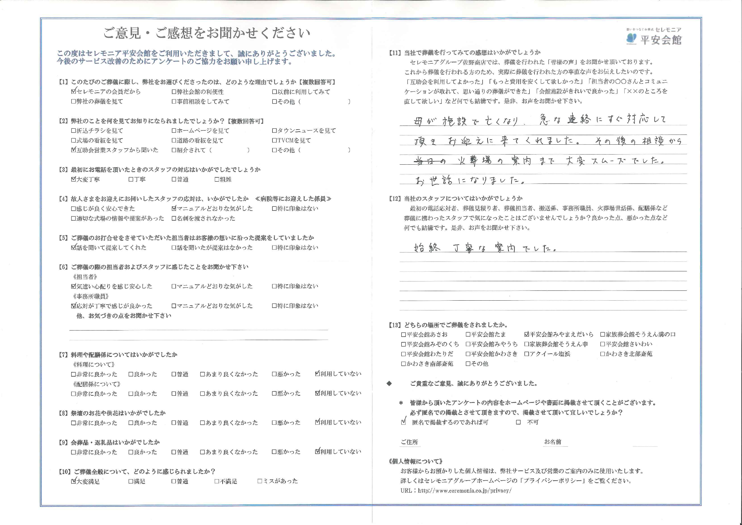 母が施設で亡くなり、急な連絡にすぐ対応して頂きお迎えに来てくれました。その後の相談から火葬場の案内まで大変スムーズでした。