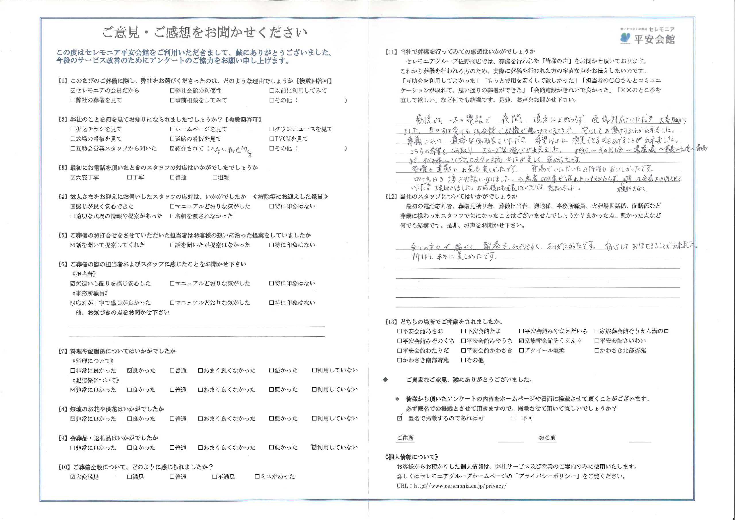 葬儀において、適格な御助言をいただき、希望以上に満足できる式をあげることが出来ました。