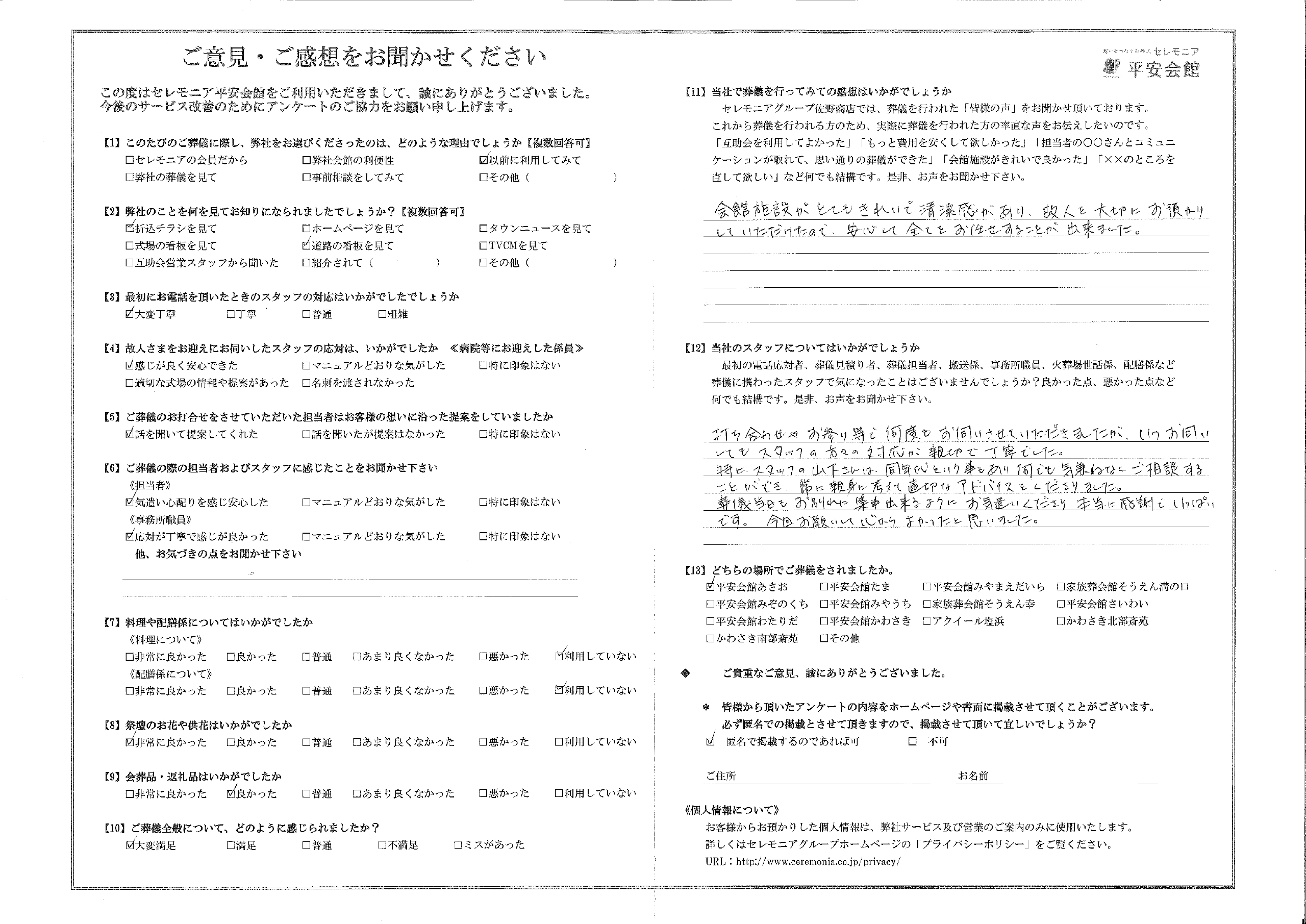 ご葬儀の際の担当者およびスタッフに感じたことをお聞かせ下さい