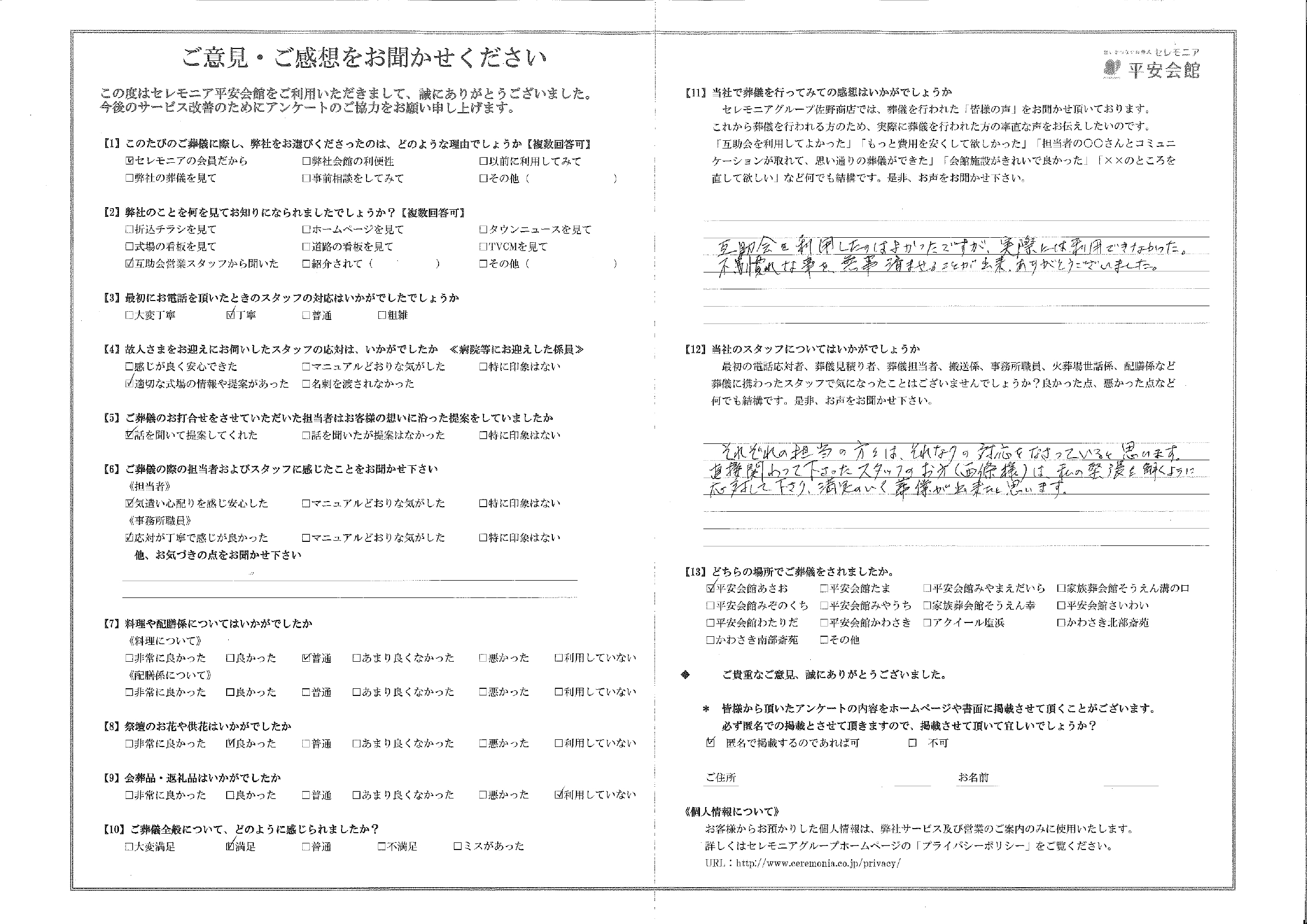 直接関わって下さったスタッフのお方(西條様)は、私の緊張を解くように応対して下さり、満足のいく葬儀が出来たと思います。