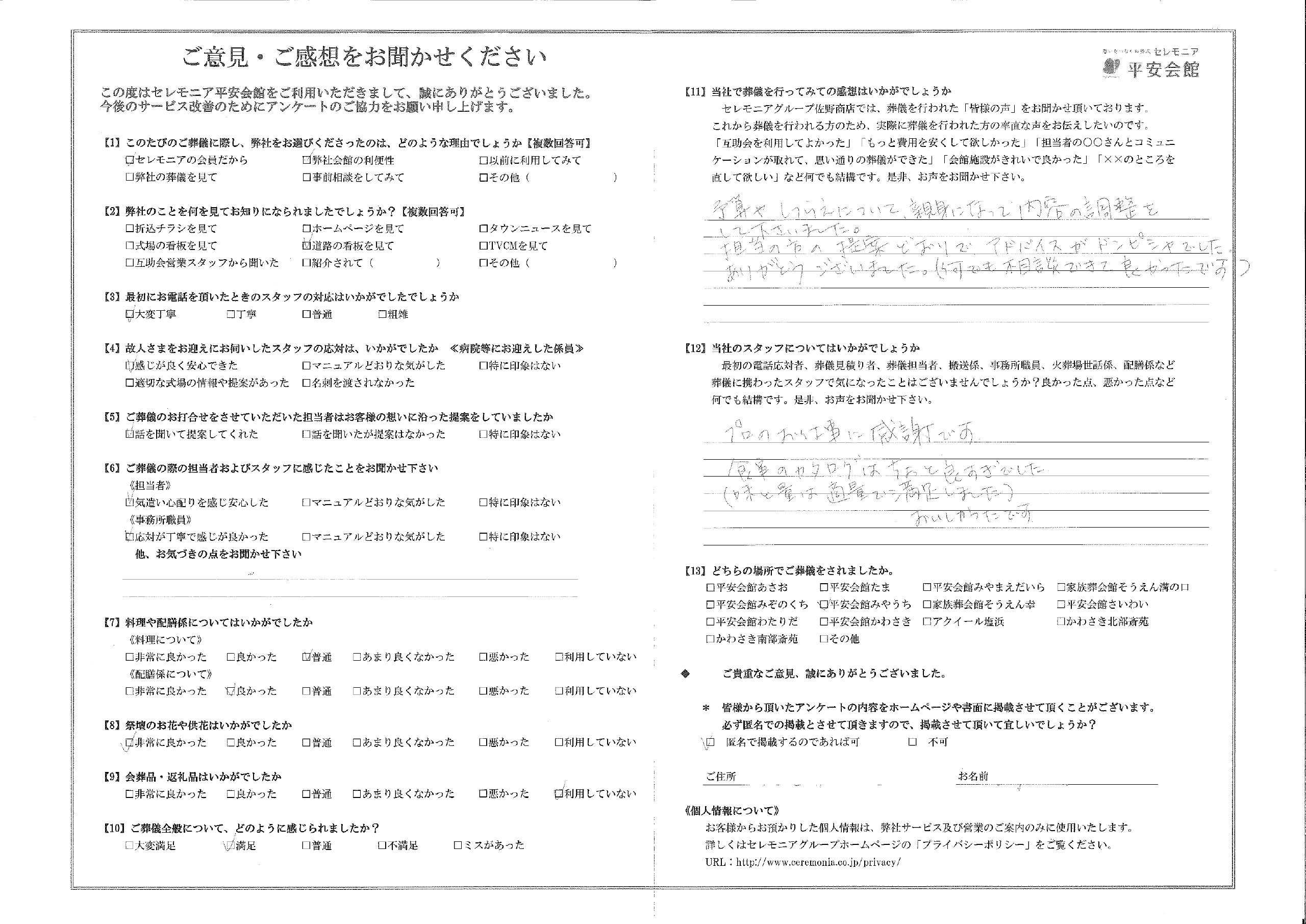 ご葬儀の際の担当者およびスタッフに感じたことをお聞かせ下さい