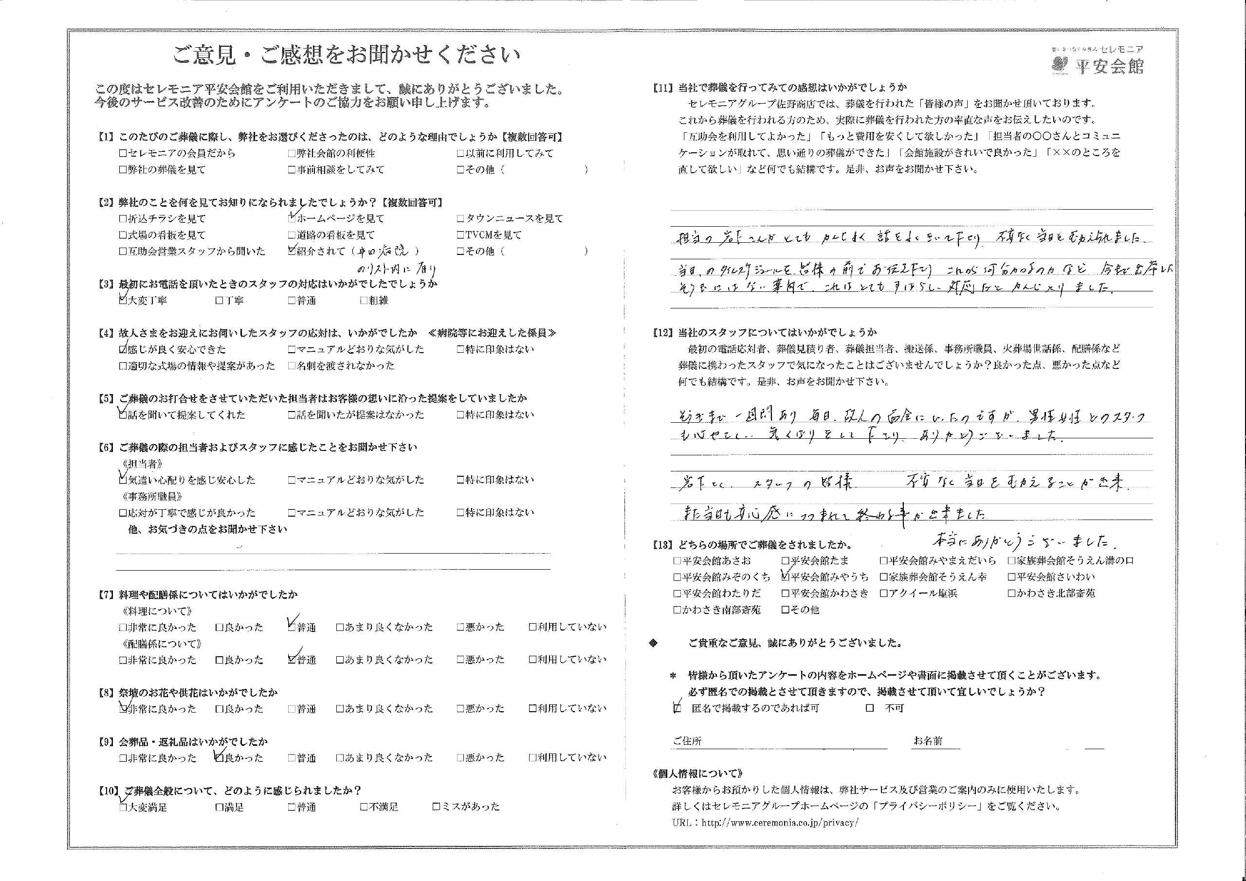 そうぎまで一週間あり毎日、故人の面会にいったのですが、男性女性どのスタッフも心やさしい気くばりをして下さり、ありがとうございました。