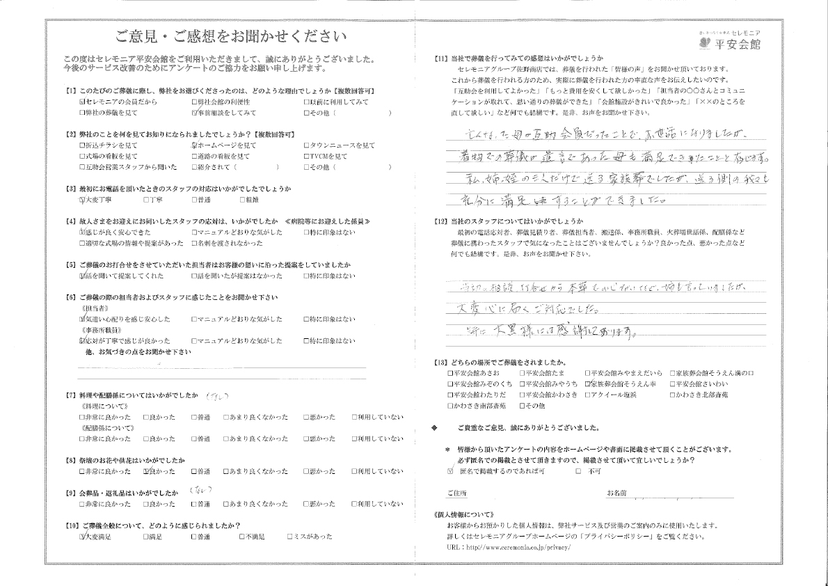 亡くなった母に互助会員だったことで、お世話になりましたが、着物での葬儀が遺言であった母も満足できたことと存じます。