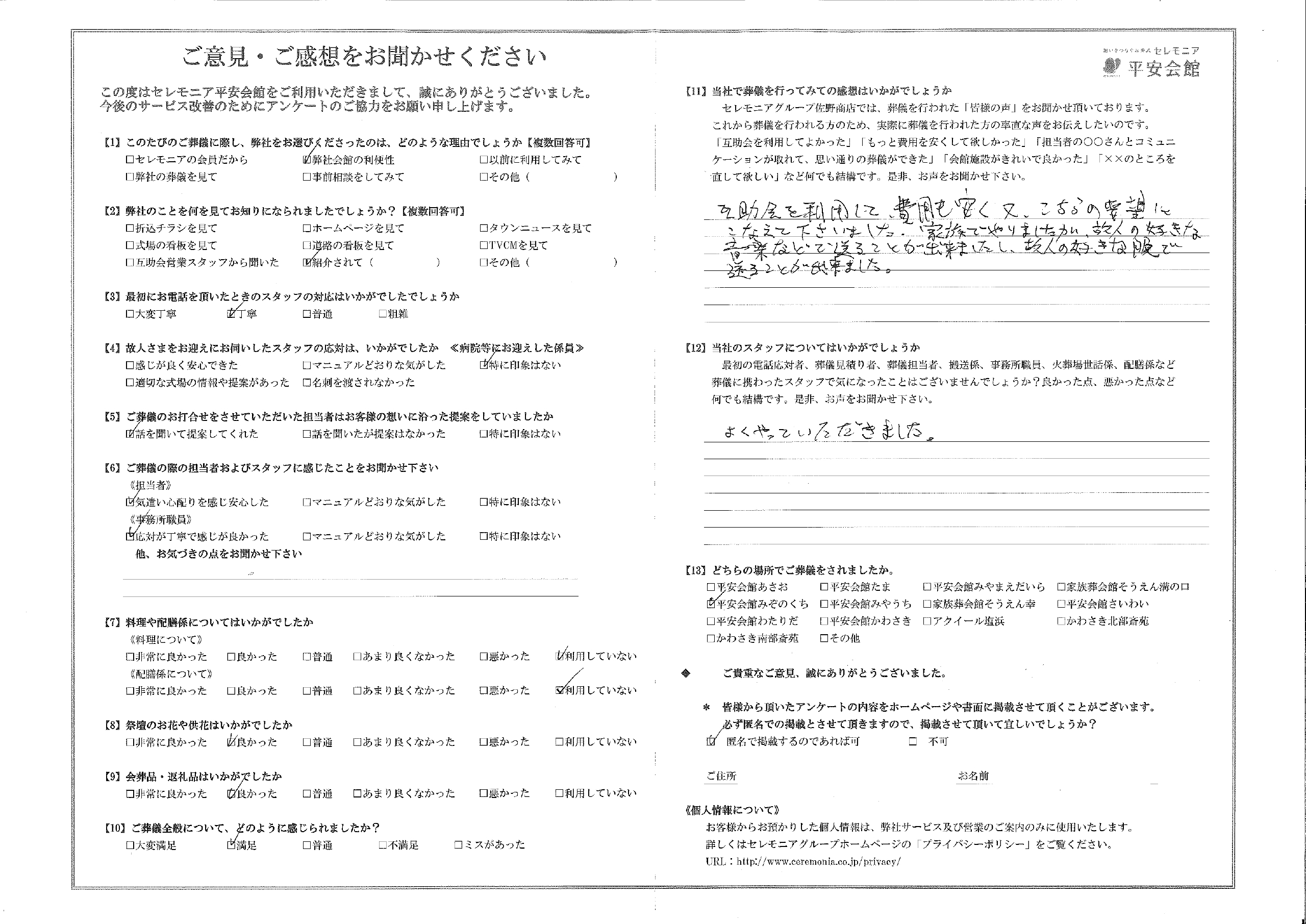 互助会を利用して費用も安く 又、こちらの要望にこたえて下さいました。家族でやりましたが、故人の好きな音楽などで送ることが出来ましたし、故人の好きな服で送ることが出来ました。