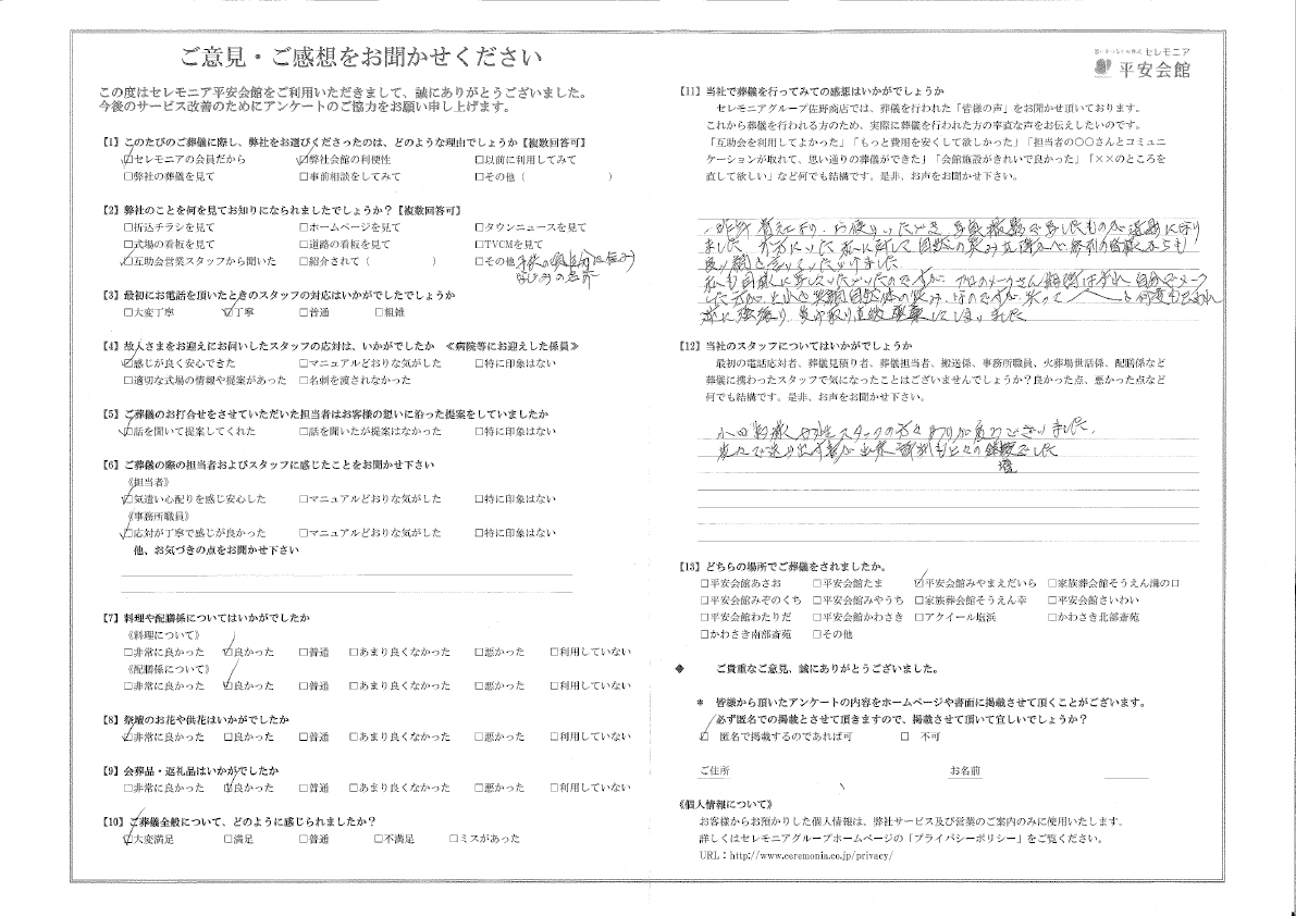 ご葬儀の際の担当者およびスタッフに感じたことをお聞かせ下さい