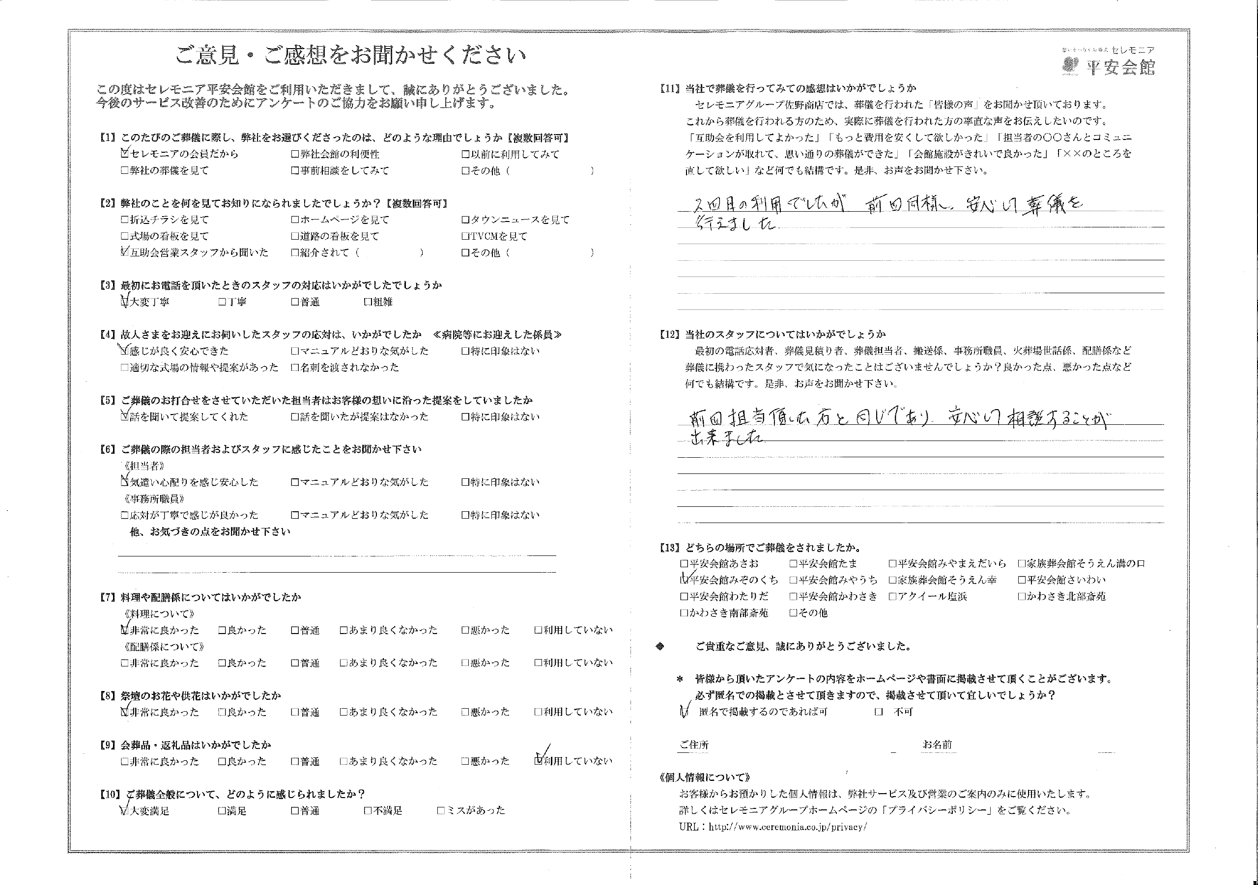 2回目の利用でしたが、前回同様、安心して葬儀を行えました。