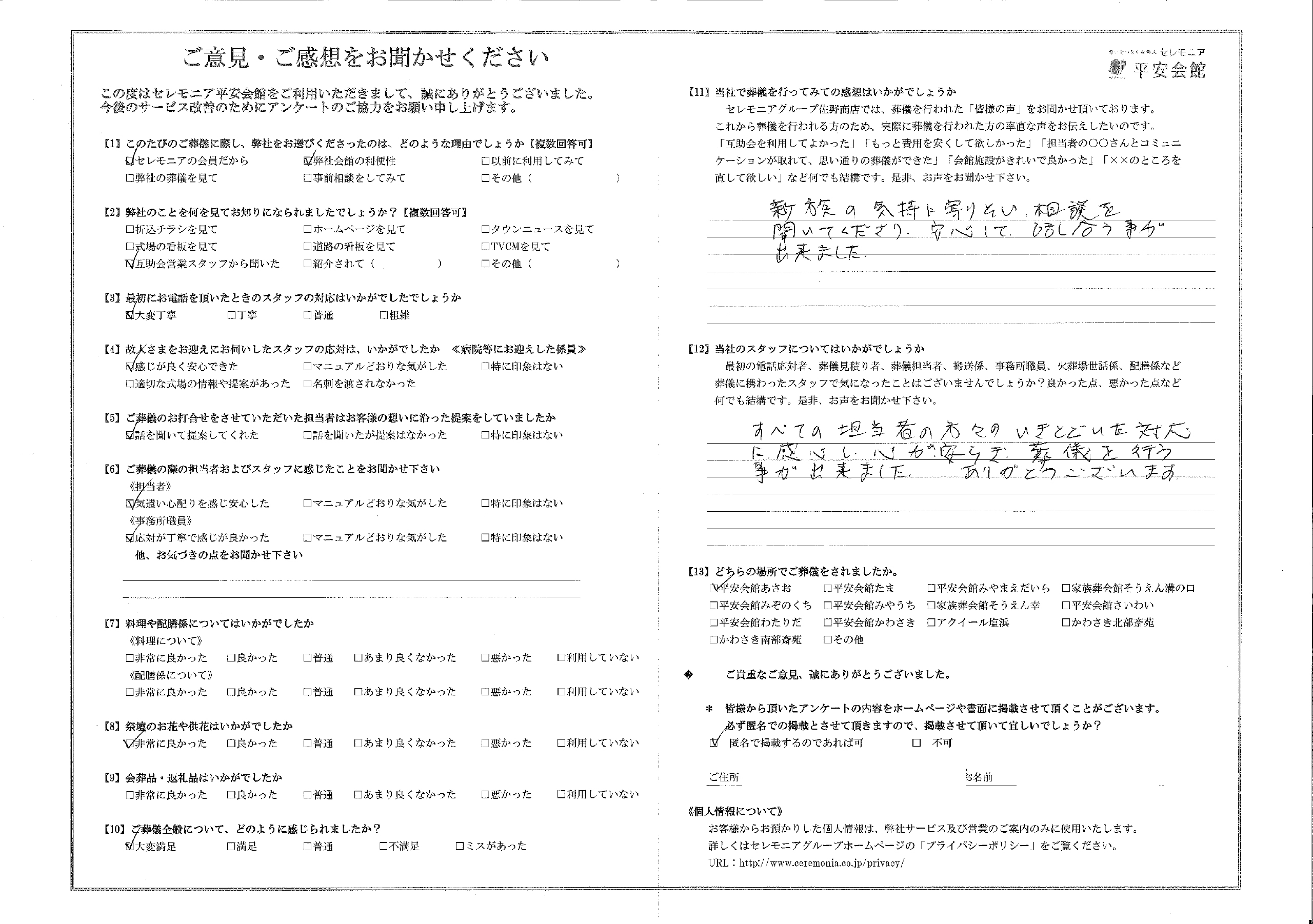 ご葬儀の際の担当者およびスタッフに感じたことをお聞かせ下さい