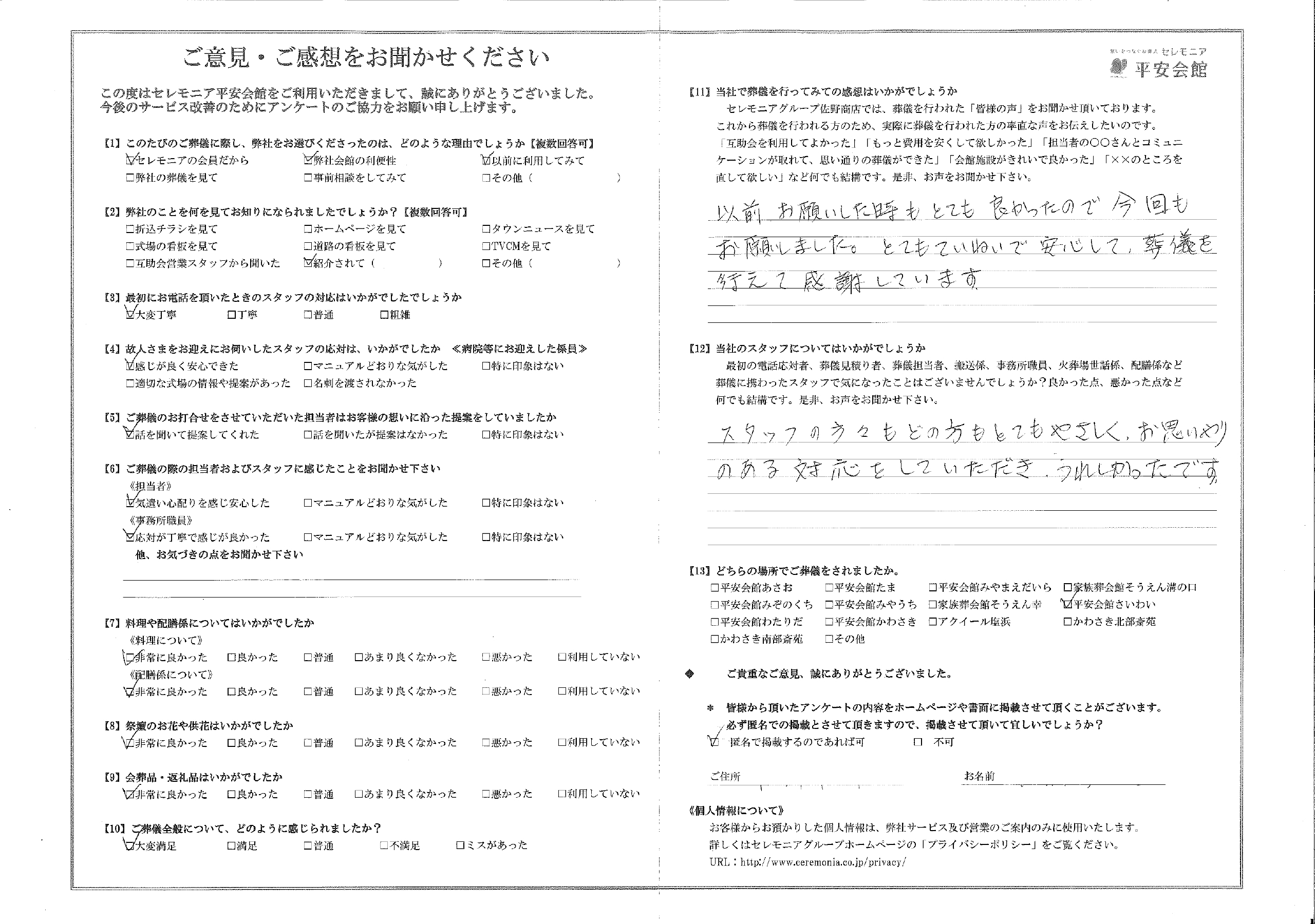 とてもていねいで安心して、葬儀を行えて感謝しています。
