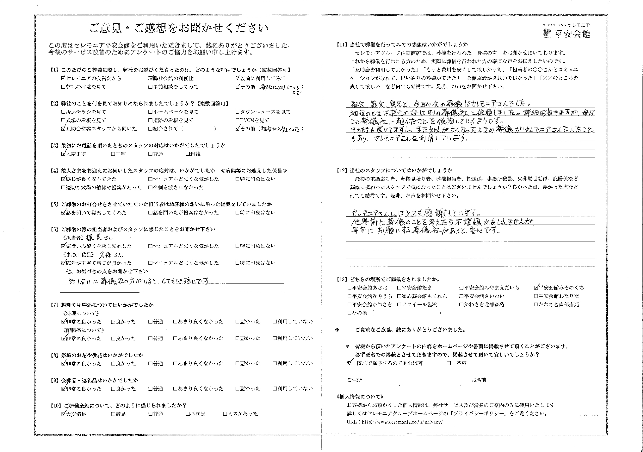 セレモニアさんにはとても感謝しています。