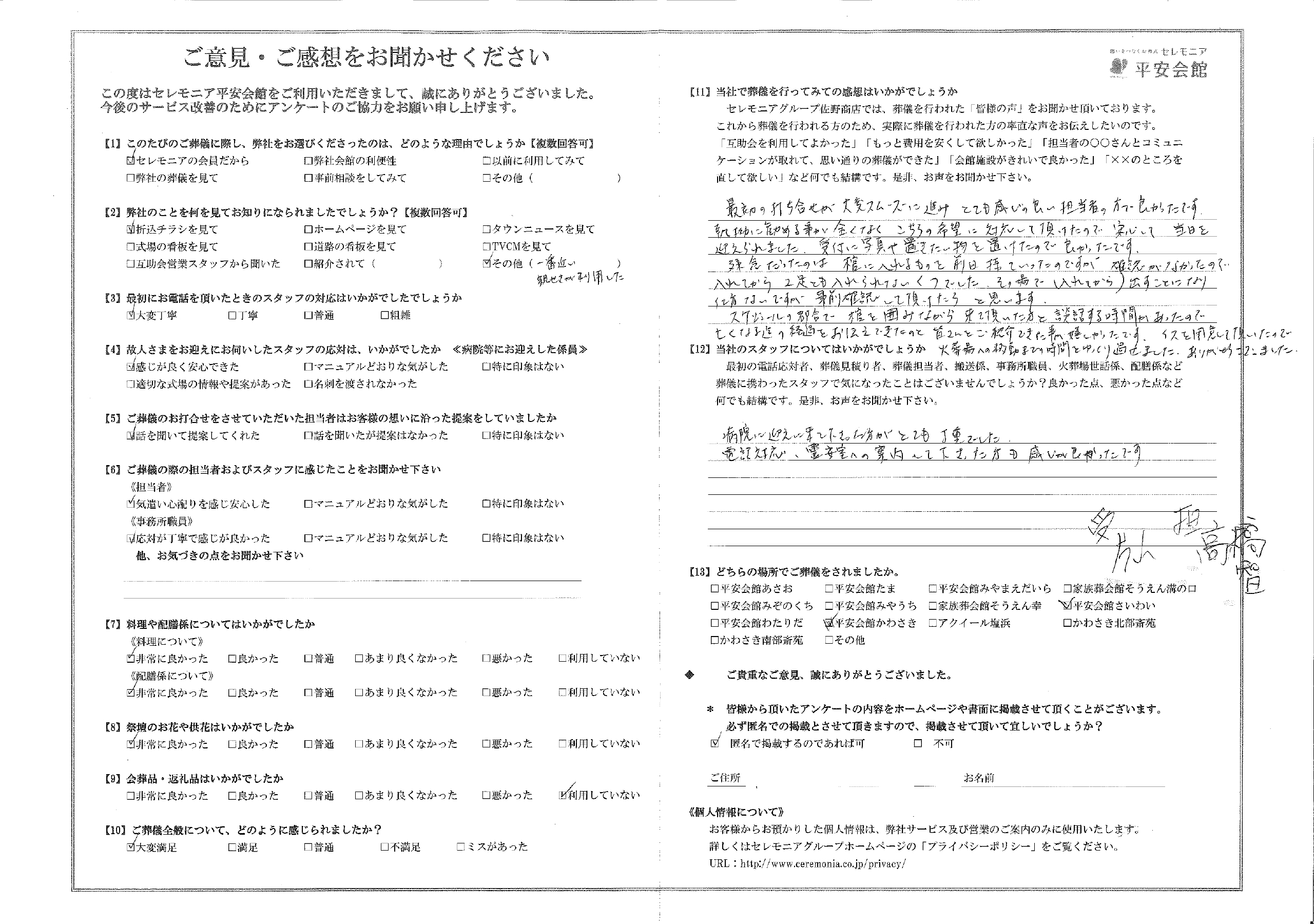 残念だったのは棺に入れるものを前日持っていったのですが、確認がなかったので、入れてから2足とも入れられないくつでした。その場で(入れてから)出すことになり、仕方ないですが事前確認して頂けたらと思います。
