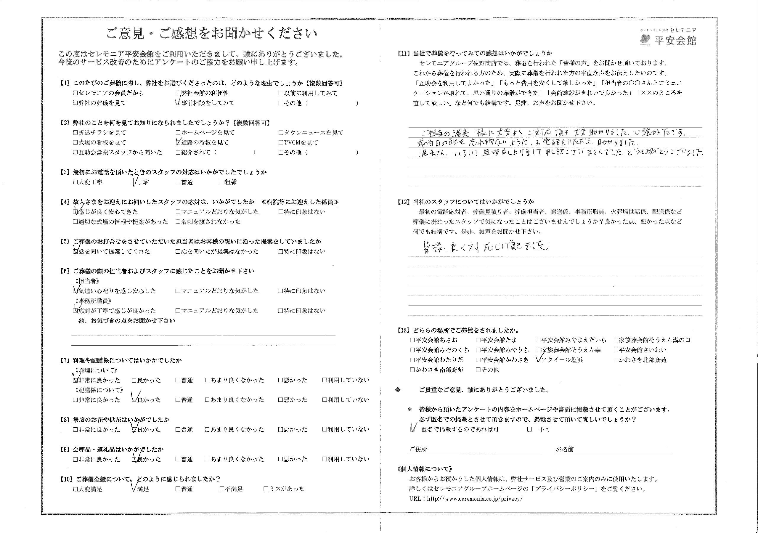 ご担当の渥美様に大変よくご対応頂き、大変助かりました。心強かったです。式の当日の朝も忘れ物ないように、お電話をいただき助かりました。
