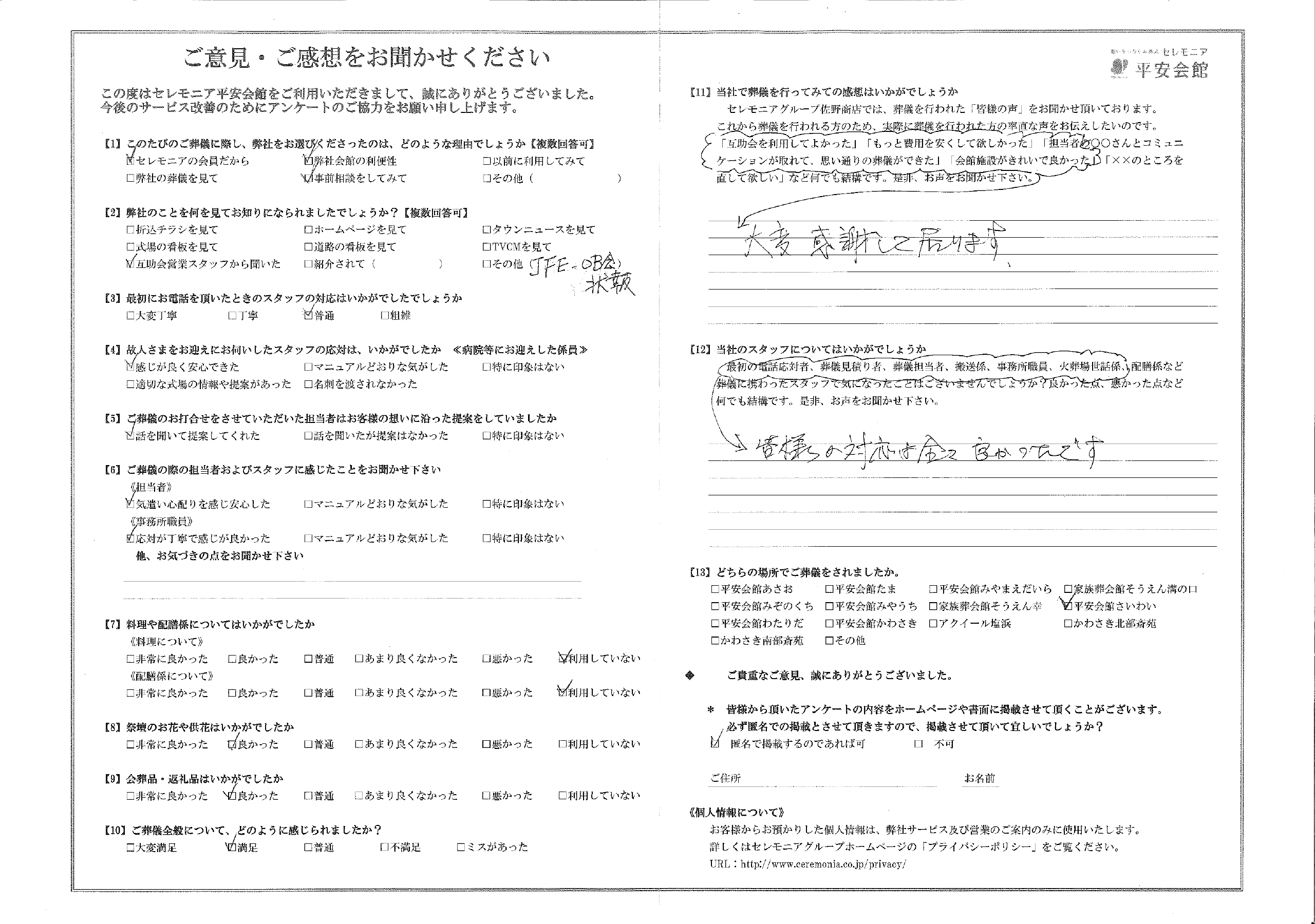 ご葬儀の際の担当者およびスタッフに感じたことをお聞かせ下さい