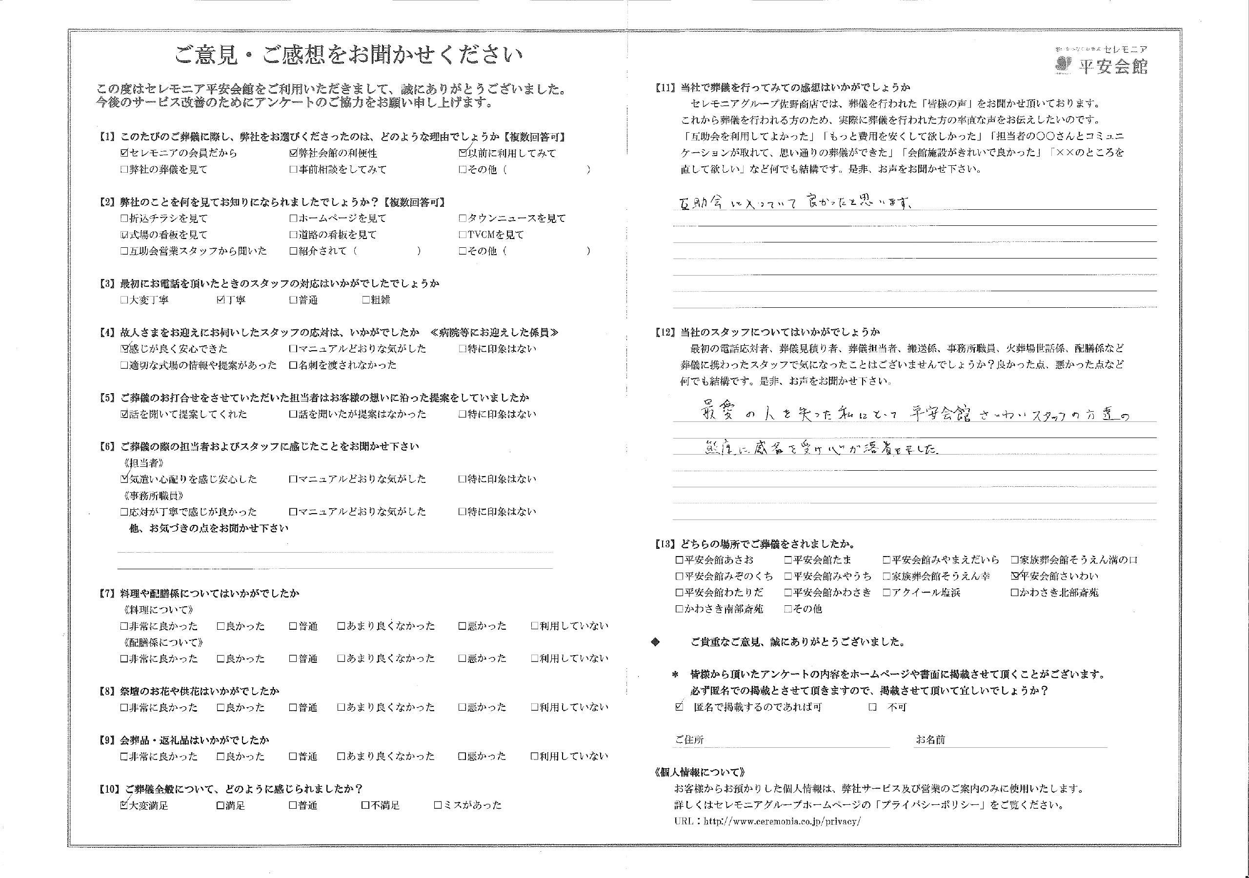 最愛の人を失った私にとって平安会館さいわいスタッフの方達の態度に感銘を受け心が落ち着きました。