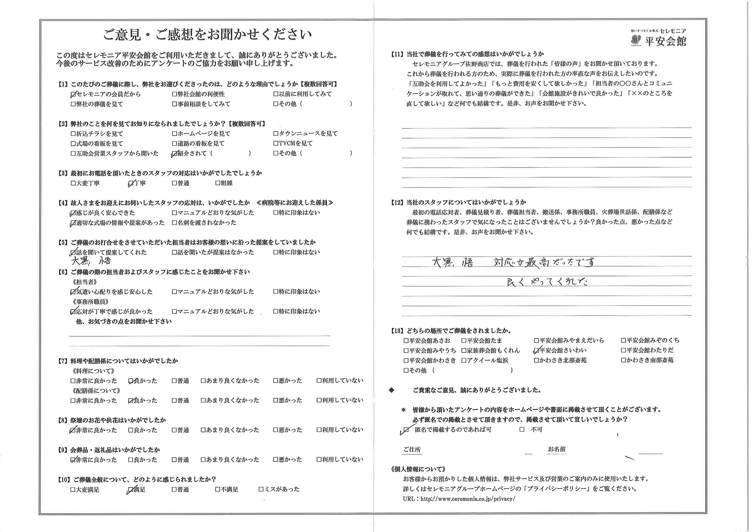 ご葬儀の際の担当者およびスタッフに感じたことをお聞かせ下さい
