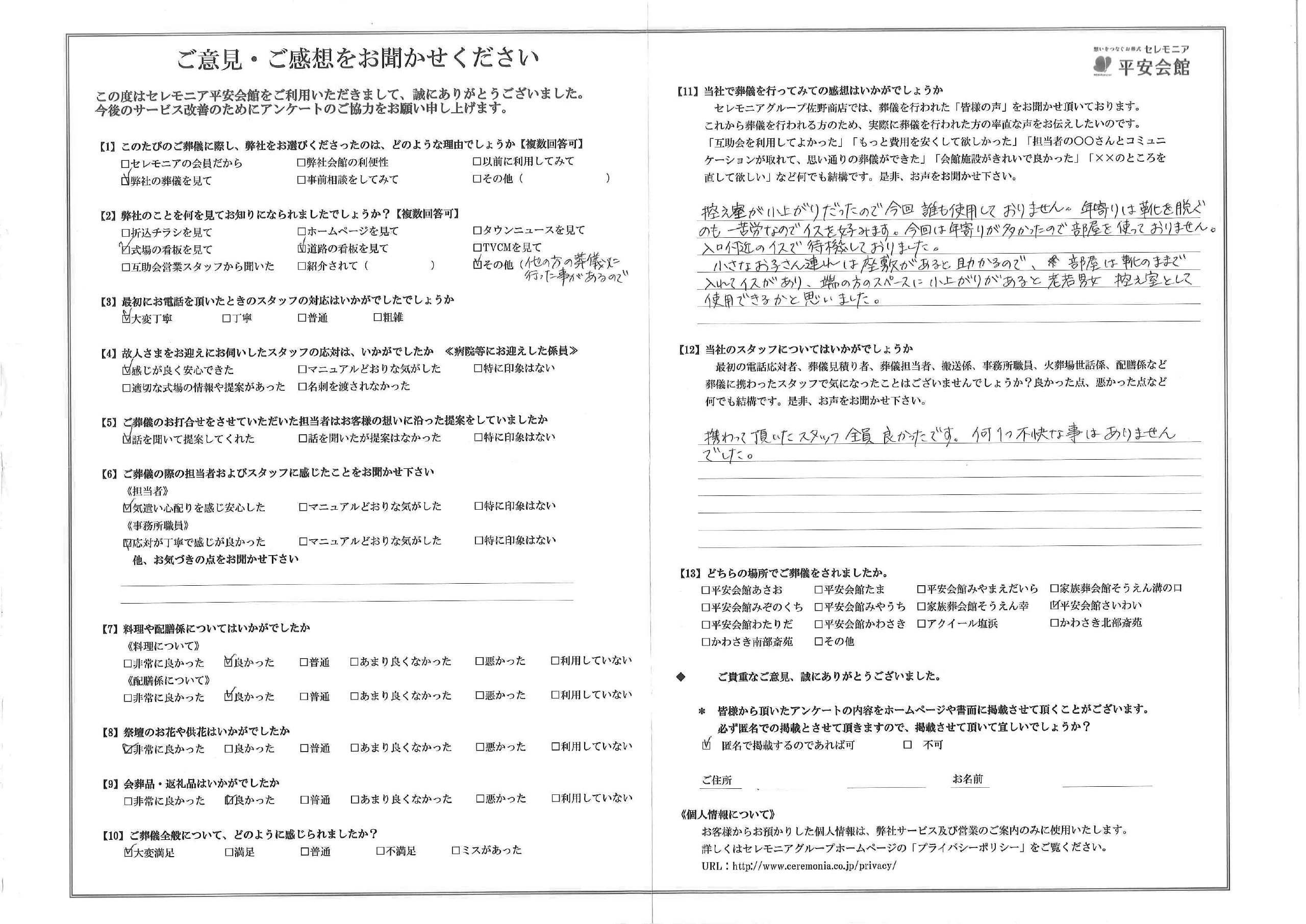 ご葬儀の際の担当者およびスタッフに感じたことをお聞かせ下さい
